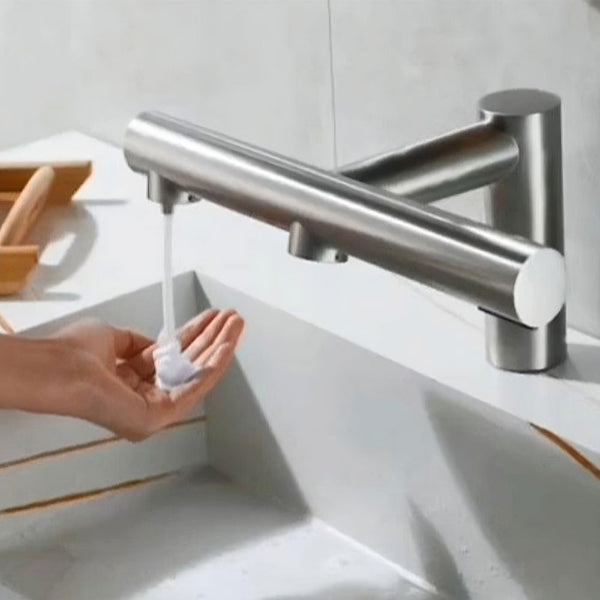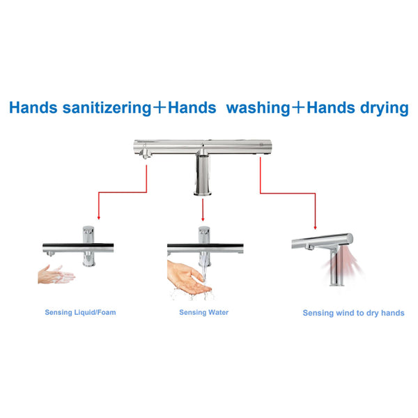 Grifería electrónica 3 en 1, para vanitorios, un diseño integrado que a través de sensores, dispensa jabón, agua y aire caliente, todo en un mismo espacio. Encendido y apagado automático.