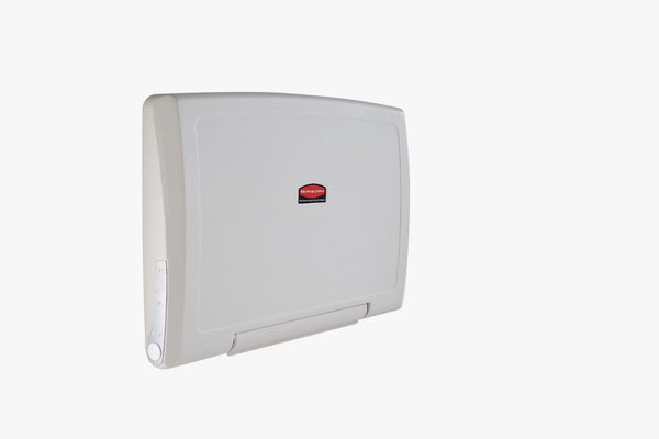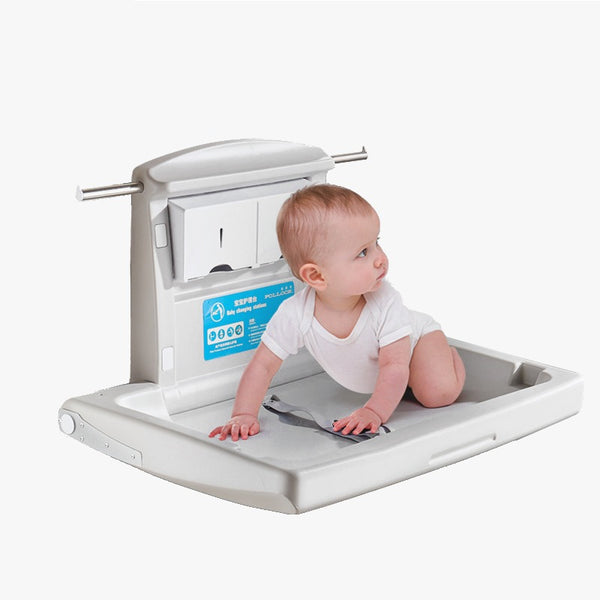 Mudador plástico en polietileno alta densidad, horizontal, abatible, con dos dispensadores de toallitas húmedas, cinturón de seguridad y dos barras metálicas laterales para colgar bolsos. Capacidad máxima 20 kg.