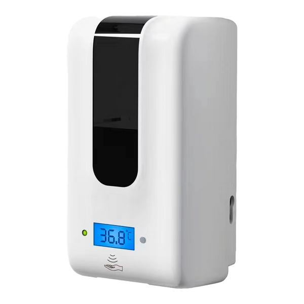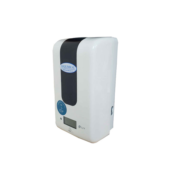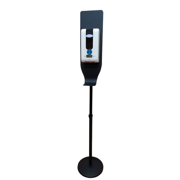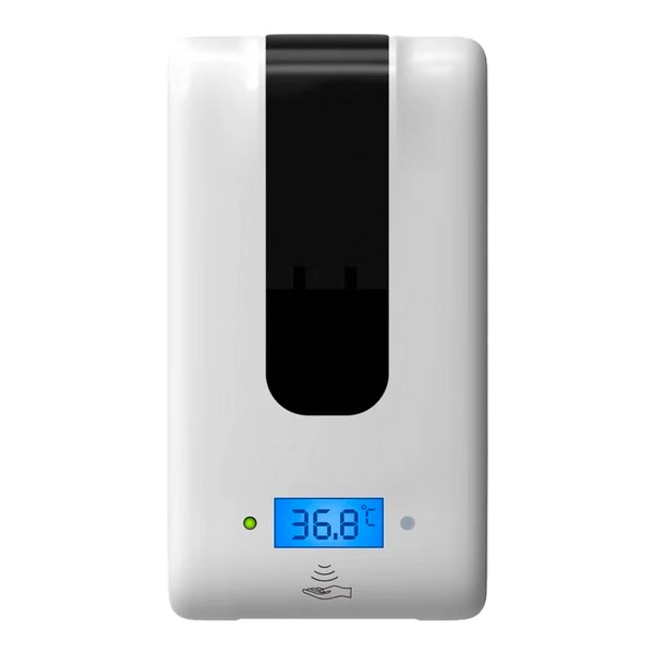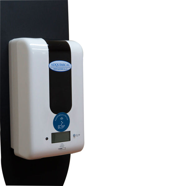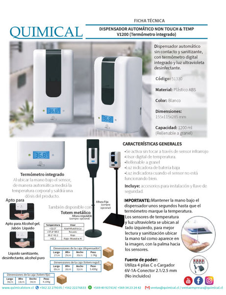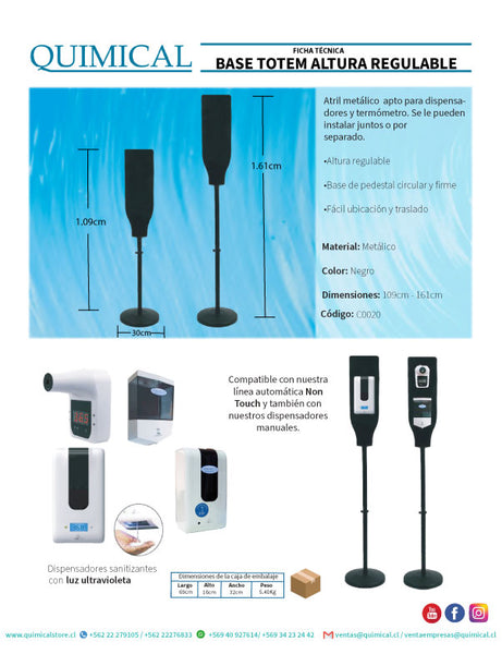 Totem altura regulable con dispensador automático con sensor infrarrojo y termómetro integrado con visor digital. Al ubicar la mano bajo el sensor, de manera automática medirá la temperatura corporal y saldrá una dósis del producto.