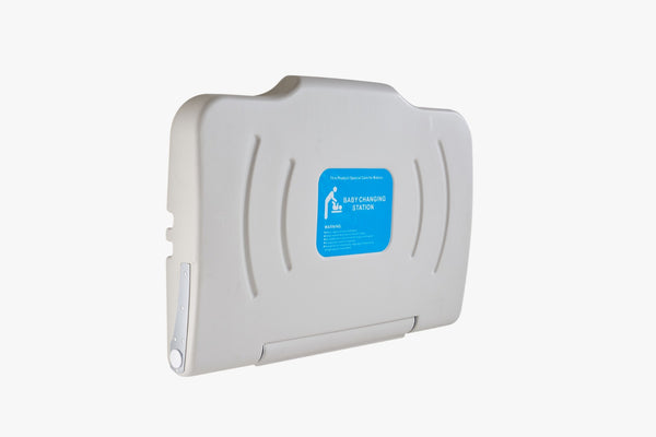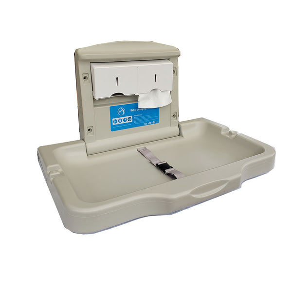 Mudador plástico en polietileno alta densidad, horizontal, abatible, con dos dispensadores de toallitas húmedas, cinturón de seguridad y dos colgadores laterales. Capacidad máxima 20 kg.