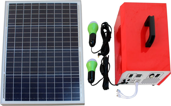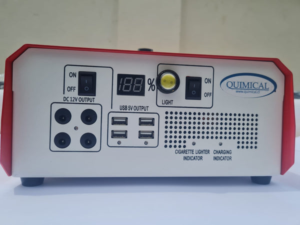 Generador portátil, silencioso y económico. Solo necesitas energía solar. Este producto es para iluminación interior o exterior protegida de la lluvia. Tiene dos caras, una frontal con corriente continua, con 4 puertos de 12 volt y 4 puertos USB de 5 V. Una cara posterior de corriente alterna (220 V), donde se conecta el panel solar y dos tomas hembras schuko, en las que se pueden conectar luces 220 volt, un equipo a la vez, de bajo consumo como: TV, ventiladores, radios, tablet, etc. Máximo 480 watt*hr.